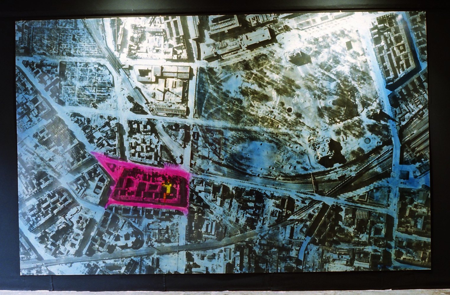 Die, vom Eingang kommend, sich links hinten befindende, kürzere Wandseite des Raumes (7,50 m lang), zeigt eine 4,90 m x 2,80 m große, fotografische Vergrößerung (eine Luftbildaufnahme der Alliierten vom März 1945).